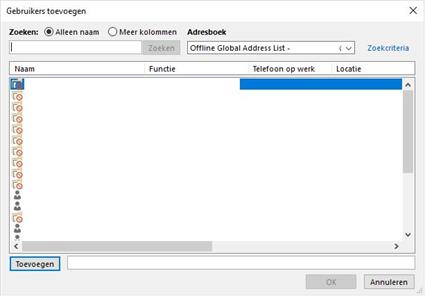 Selecteer in het dialoogvenster 'Gebruikers toevoegen' de gebruiker waarmee u uw postvak wilt delen en klik vervolgens op de knop 'Toevoegen'.
