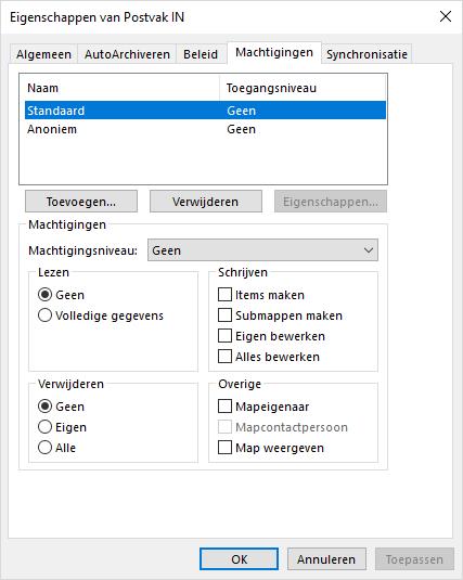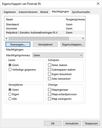 Selecteer in het dialoogvenster 'Eigenschappen van Postvak In' de gebruiker welke u zojuist hebt toegevoegd en selecteer het gewenste machtigingsniveau.